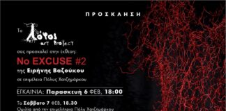 No EXCUSE#2 Λόφος art Λόφος art projectΕγκαίνια: Παρασκευή 6 Φεβρουαρίου στις 18,00Επιμέλεια Polly Hatzimarkou Επίσης το Σάββατο 7 Φεβρουαρίου στις 18,30 μία εξαιρετική παρουσίαση της επιμελήτριας στον...