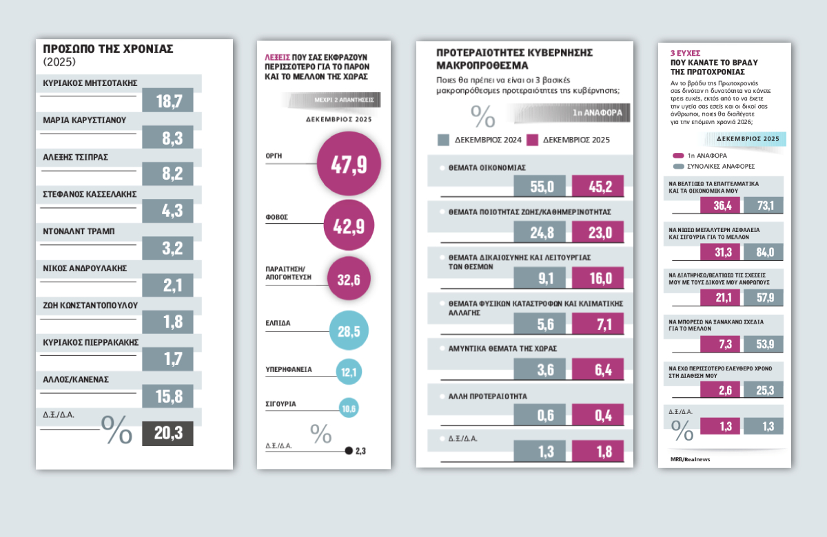Τον πρωθυπουργό Κυριάκο Μητσοτάκη και μάλιστα με διακριτή διαφορά αναδεικνύουν οι πολίτες ως το πρόσωπο της χρονιάς που πέρασε, αναγνωρίζοντάς τον ως τον βασικό πρωταγωνιστή των εξελίξεων του 2025. Την ίδια ώρα ιδιαίτερα ενδιαφέροντα είναι τα ευρήματα της MRB για την πολιτική Τραμπ ειδικά μετά τις ενεργειακές συμφωνίες με τη Chevron, την παρουσία της νέας πρέσβεως των ΗΠΑ στην Αθήνα Κίμπερλι Γκιλφόιλ, αλλά και για τον πόλεμο στην Ουκρανία, για τον οποίο μετά από σχεδόν τέσσερα χρόνια συγκρούσεων η συντριπτική πλειοψηφία της κοινωνίας εμφανίζει σημάδια κόπωσης και ζητά τον άμεσο τερματισμό του ακόμα και με παραχώρηση ουκρανικών εδαφών στη Ρωσία. Πρόσωπο της χρονιάς για το 2025 αναδεικνύεται ο πρωθυπουργός Κυριάκος Μητσοτάκης με ποσοστό 18,7%, επιβεβαιώνοντας ότι η πολιτική επικαιρότητα κυριάρχησε στη δημόσια συζήτηση. Ακολουθεί η Μαρία Καρυστιανού με 8,3% και ο Αλέξης Τσίπρας με 8,2%. Για το 2026 οι πολίτες βλέπουν ως πρόσωπο που θα πρωταγωνιστήσει τον Αλ. Τσίπρα με 15,9%, ακολουθεί ο Κυριάκος Μητσοτάκης με 12,1% και η Μ. Καρυστιανού με 6,7%.