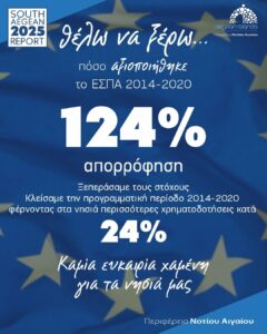 “Το 2025, έκλεισε διοικητικά και οικονομικά, το ΕΣΠΑ 2014-2020. Η πρώτη ερώτηση που προκύπτει σε κάθε τέτοια περίσταση είναι μία: αξιοποιήθηκαν οι πόροι που ήταν διαθέσιμοι; Απαντάμε: και με το παραπάνω.Στο 124% κλείσαμε το ΕΣΠΑ 2014-2020 και αυτό γιατί δεν θέλουμε να πάει χαμένη καμία ευκαιρία για τα νησιά μας”.