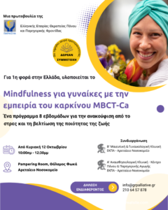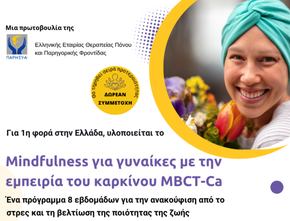Η Ελληνική Εταιρία Θεραπείας Πόνου και Παρηγορικής Φροντίδας (ΠΑΡΗ.ΣΥ.Α.), σε συνεργασία με τη Β’ Μαιευτική-Γυναικολογική Κλινική και την Α’ Αναισθησιολογική Κλινική – Κέντρο Πόνου & Παρηγορικής Θεραπείας του ΕΚΠΑ, προσφέρει δωρεάν για πρώτη φορά στην Ελλάδα το εξειδικευμένο πρόγραμμα Γνωσιακής Θεραπείας με Βάση το Mindfulness για Ογκολογικούς Ασθενείς (MBCT-CA), στο Αρεταίειο Νοσοκομείο.