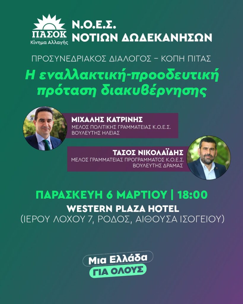 Η Νομαρχιακή Οργανωτική Επιτροπή Συνεδρίου ΠΑΣΟΚ- Κινήματος Αλλαγής Νοτίων Δωδεκανήσων καλεί τα μέλη και τους φίλους του Κινήματος να συμμετάσχουν στην ανοιχτή εκδήλωση για τον προσυνεδριακό διάλογο και την καθιερωμένη κοπή της πρωτοχρονιάτικης πίτας.