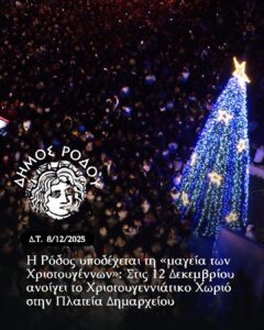 Η Ρόδος φορά τα γιορτινά της για να υποδεχθεί με λάμψη, χαρά και αισιοδοξία την εορταστική περίοδο των Χριστουγέννων και της Πρωτοχρονιάς. Την Παρασκευή 12 Δεκεμβρίου θα πραγματοποιηθεί η έναρξη λειτουργίας του Χριστουγεννιάτικου Χωριού, το οποίο φέτος “φιλοξενείται” στην Πλατεία Δημαρχείου. Ξύλινα σπιτάκια με ιδιαίτερες γαστρονομικές επιλογές, παιχνίδια για τα παιδιά, το παγοδρόμιο και ο γιορτινός διάκοσμος θα συνθέτουν έναν φιλόξενο χώρο, όπου μικροί και μεγάλοι θα μπορούν να απολαμβάνουν όμορφες στιγμές με ασφάλεια και χαρούμενη διάθεση.