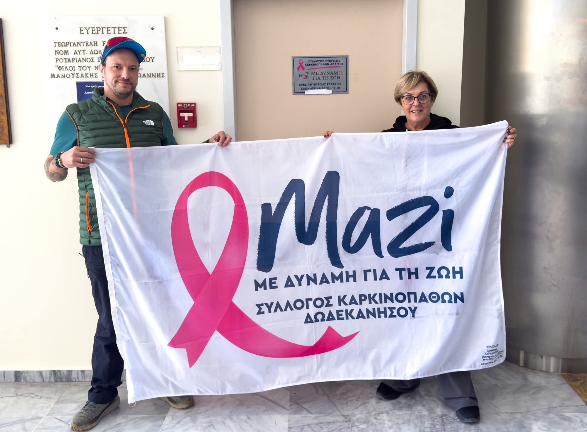 Ο Σύλλογος Στήριξης Καρκινοπαθών Δωδεκανήσου «ΜΑΖΙ Με Δύναμη για τη Ζωή» υποδέχθηκε με συγκίνηση τον συμπολίτη μας Δημήτρη Καραβόλια, ο οποίος, μετά την επιτυχή ανάβαση στον Μύτικα – την ψηλότερη κορυφή της Ελλάδας στα 2.918 μ. – επέστρεψε στη Ρόδο για να παραδώσει συμβολικά στα γραφεία του Συλλόγου τη σημαία μας, την οποία ύψωσε στην κορυφή του Ολύμπου.