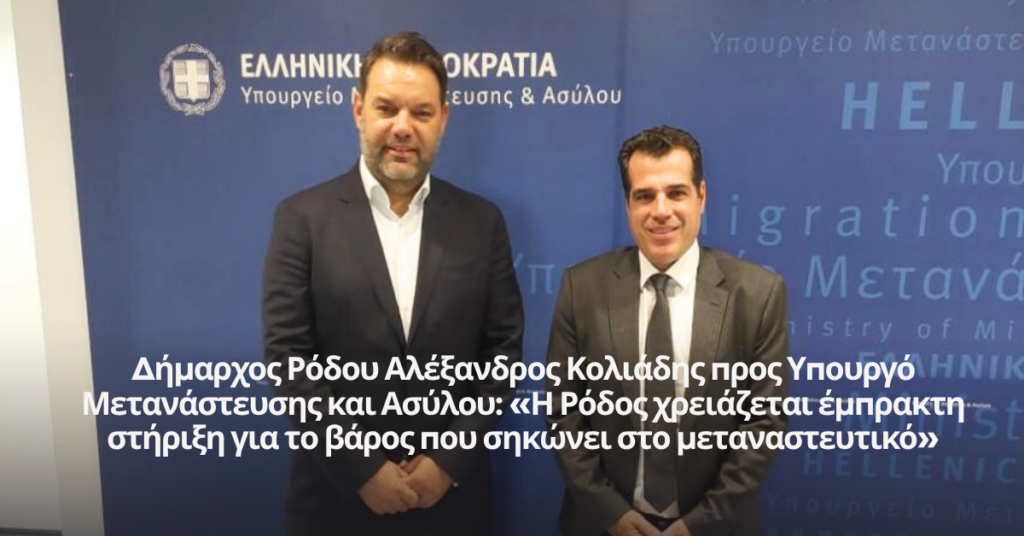 Δήμαρχος Ρόδου Αλέξανδρος Κολιάδης προς Υπουργό Μετανάστευσης και Ασύλου: «Η Ρόδος χρειάζεται έμπρακτη στήριξη για το βάρος που σηκώνει στο μεταναστευτικό»