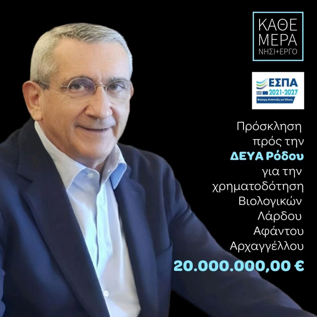 Πρόσκληση προς τη ΔΕΥΑΡ από την Περιφέρεια Νοτίου Αιγαίου για τη χρηματοδότηση των βιολογικών Λάρδου, Αφάντου, Αρχαγγέλου, ύψους 20.000.000 ευρώ.