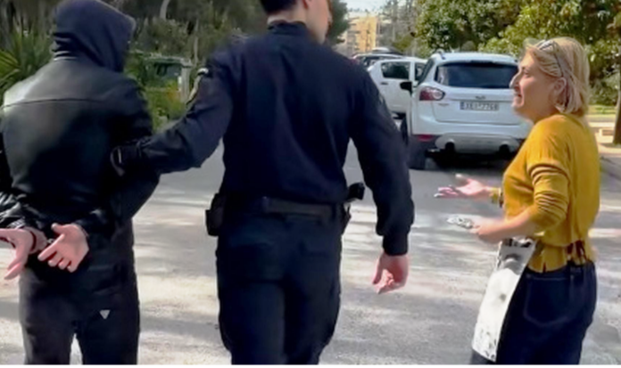 Στο βίντεο εμφανίζεται μια γυναίκα δίπλα σε έναν αστυνομικό που έχει συλλάβει ένα άτομο και να τον ρωτά γιατί προχώρησε στην σύλληψη «για λίγο καπνό».