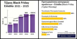 Σημειωτέον πως ο τζίρος της Black Friday εκτιμάται στα 74 δις δολάρια παγκοσμίως και στα 11 δις δολάρια στις ΗΠΑ, ενώ στην Ελλάδα τα τελευταία τρία χρόνια ο τζίρος της Black Friday κατά τη διάρκεια του Νοεμβρίου από τα 100 εκατ. ευρώ τριπλασιάστηκε στα 300 εκατ. ευρώ. Παράλληλα βλέπουμε στην ελληνική αγορά μια σημαντική μεταβολή με διπλασιασμό των διαδικτυακών αγορών έναντι της επισκεψιμότητας στα φυσικά εμπορικά καταστήματα με ποσοστό άνω του 40%.