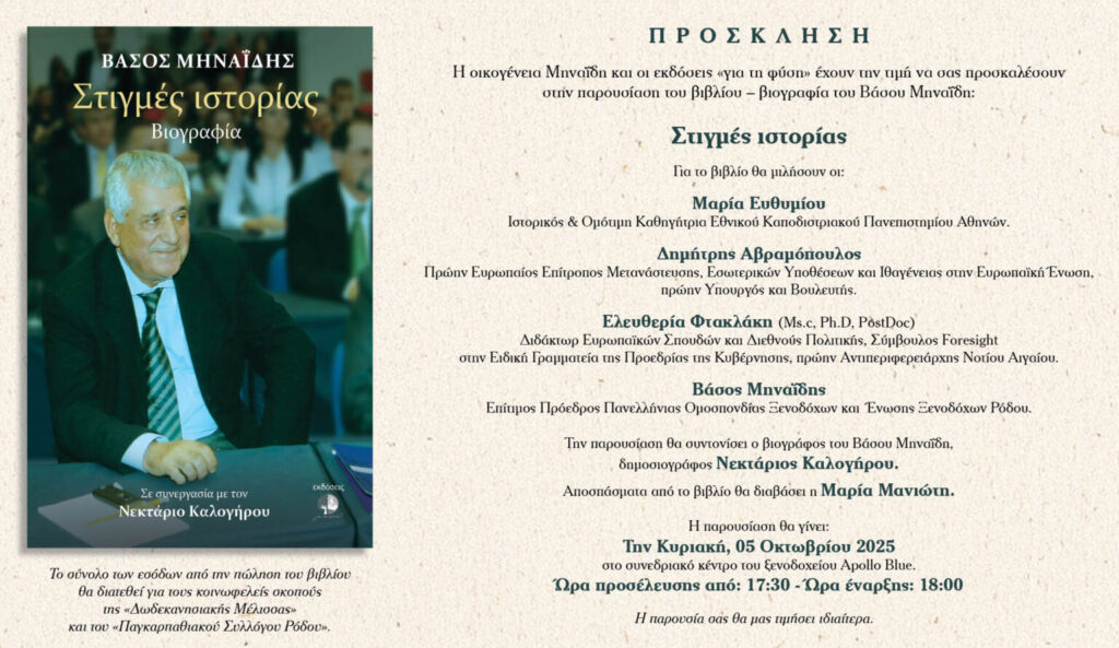 Την Κυριακή το απόγευμα στις 18:00, στο ξενοδοχείο Apollo blue, στο Φαληράκι θα παρουσιαστεί η αυτοβιογραφία του Βασίλη Μηναΐδη «Στιγμές ιστορίας», όπου περιγράφει με πολύτιμο συνεργάτη το Νεκτάριο Καλογήρου, τη ζωή του από την Κάρπαθο στη Ρόδο, στη Δωδεκάνησο, από την Ιταλοκρατία, στους Γερμανούς, στην ελεύθερη Δωδεκάνησο και στη δημιουργία του τουριστικού θαύματος της Ρόδου.